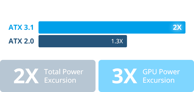 Gemäß der neuesten ATX 3.1- und PCIe Gen 5.1-Verordnung unterstützt diese Serie 2 x die Gesamtleistung und 3 x die GPU-Leistung.